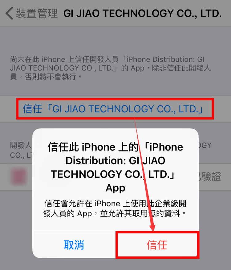 因 iOS9 的安全性更新,需進入設定裡面點選信任後才能開始使用。